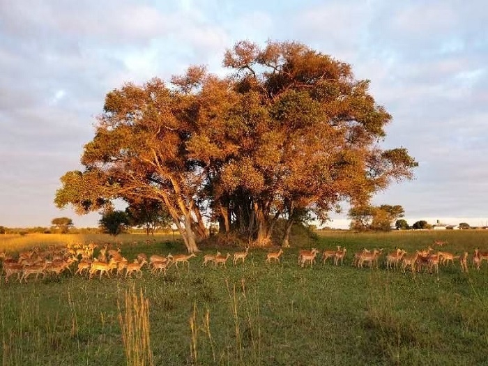 天際蔚藍,夕陽西下,枯藤老樹昏鴉,遼闊無邊的曠野,肆意奔跑的野生動物。這些才應該最真實原始的非洲,是非洲最本來的意義,也是出國前所向往的景象。坐在敞篷觀光車上,迎著習習涼風,用手擋住夕陽余暉的瞬間,驀然有了一絲感觸?!吧畈恢寡矍暗钠埱?,還有詩和遠方的田野...