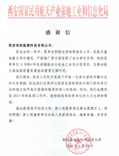 頃刻能源公司收到來(lái)自航天基地工業(yè)和信息化局感謝信