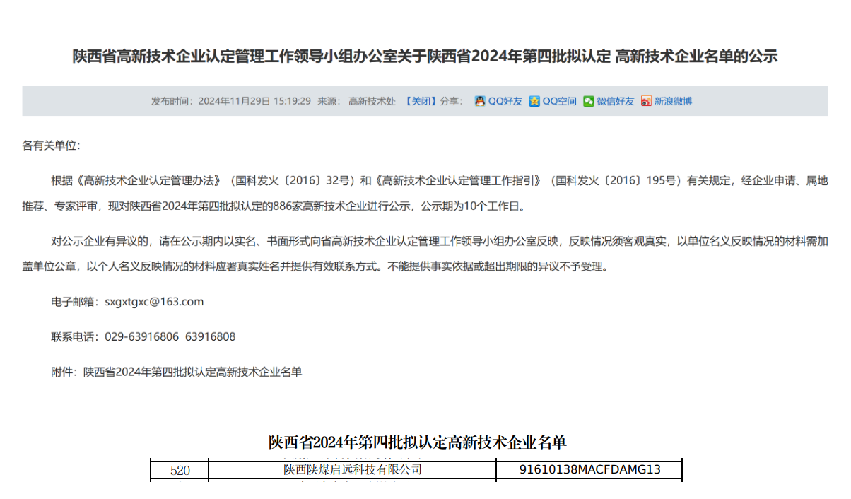近日,從陜西省高新技術企業認定管理工作領導小組辦公室獲悉,陜西陜煤啟遠科技有限公司成功入選陜西省2024年第四批高新技術企業名單,標志著公司在科技創新、技術研發及市場拓展方面得到了進一步認可,為今后高質量發展奠定了堅實基礎。啟遠科技公司自成立以來,始終把科技...