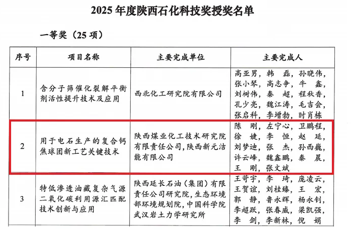 綠色低碳制電石先進工藝:榮獲2025年度陜西石化科技獎“一等獎”