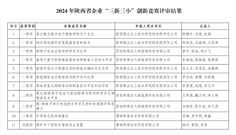 近日,省科協公布2024年陜西省企業“三新三小”創新競賽評審結果,陜煤研究院組織參賽的11個項目脫穎而出,其中“高分散亞微米電子銀粉研制及產業化”等5個項目榮獲一等獎、“新型鋰電池負極粘結劑的開發與應用”等5個項目榮獲二等獎、“煤礦井下膠輪車智能洗塵裝置”項目榮獲優勝獎...