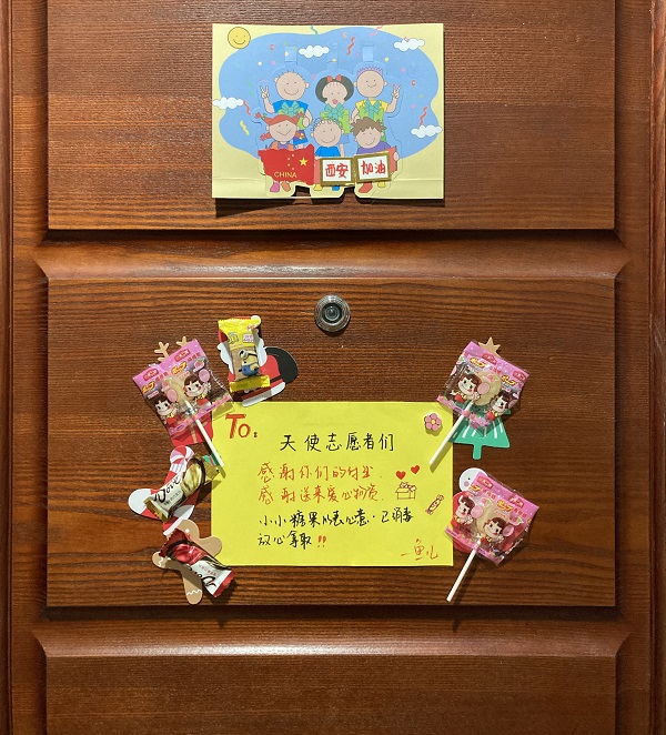 他說:“當(dāng)負(fù)重入戶送物資,碰到一居家隔離戶在自家門外貼著便簽‘感謝信’和數(shù)枚棒棒糖時(shí),心里真是又暖又甜。有堅(jiān)強(qiáng)有力的黨組織領(lǐng)導(dǎo),有各行各業(yè)自發(fā)逆行的志愿者,有理解支持信任志愿工作的廣大群眾,還有源源不斷輸送的‘陜煤力量’,相信我們定能打贏這場(chǎng)疫情防控阻擊戰(zhàn)!”
